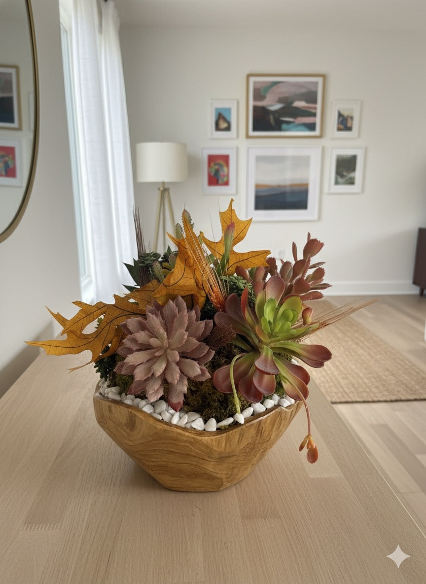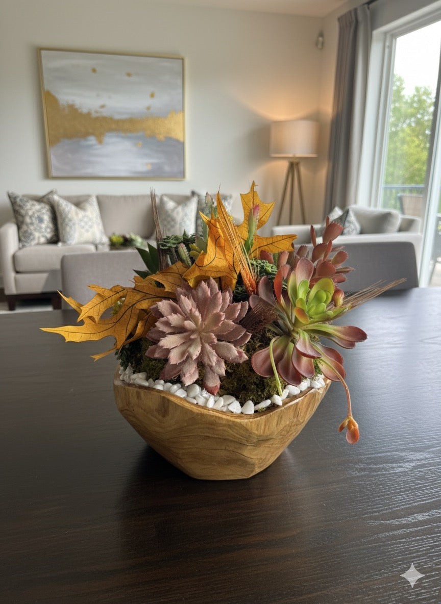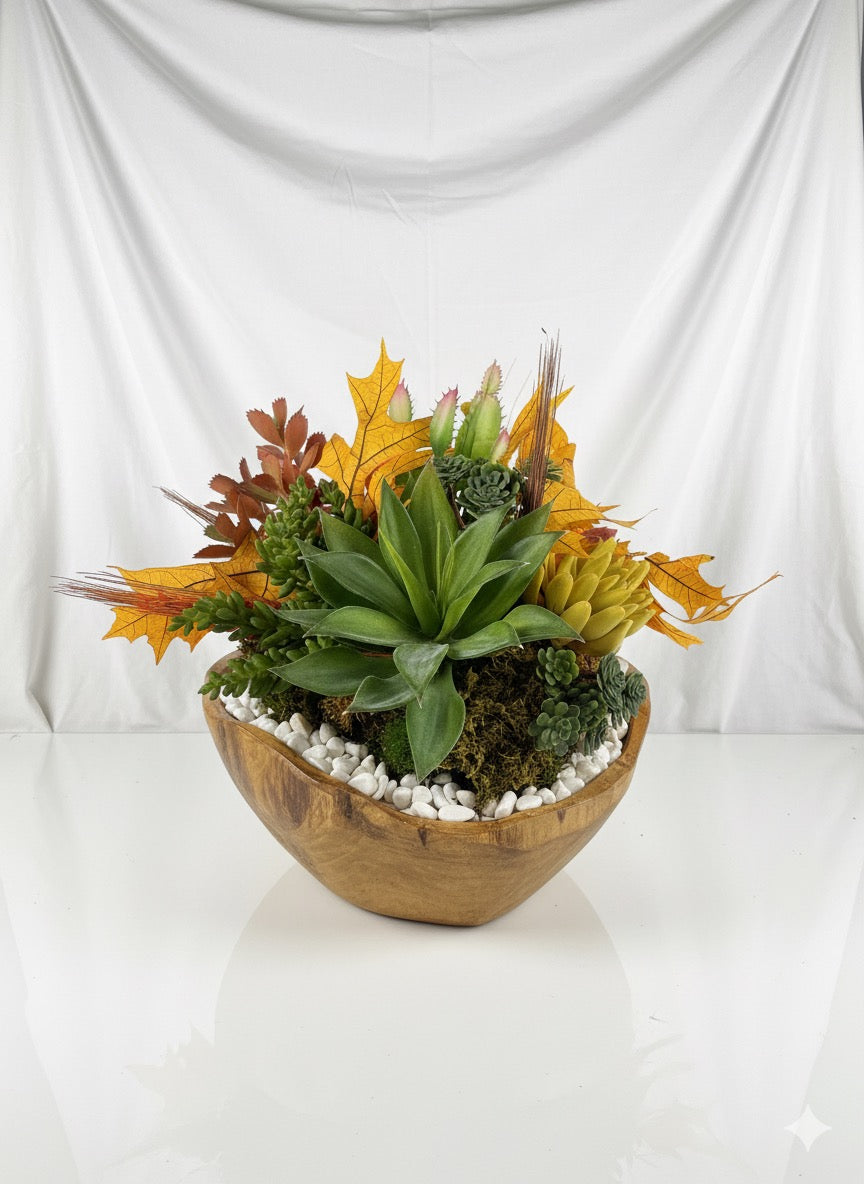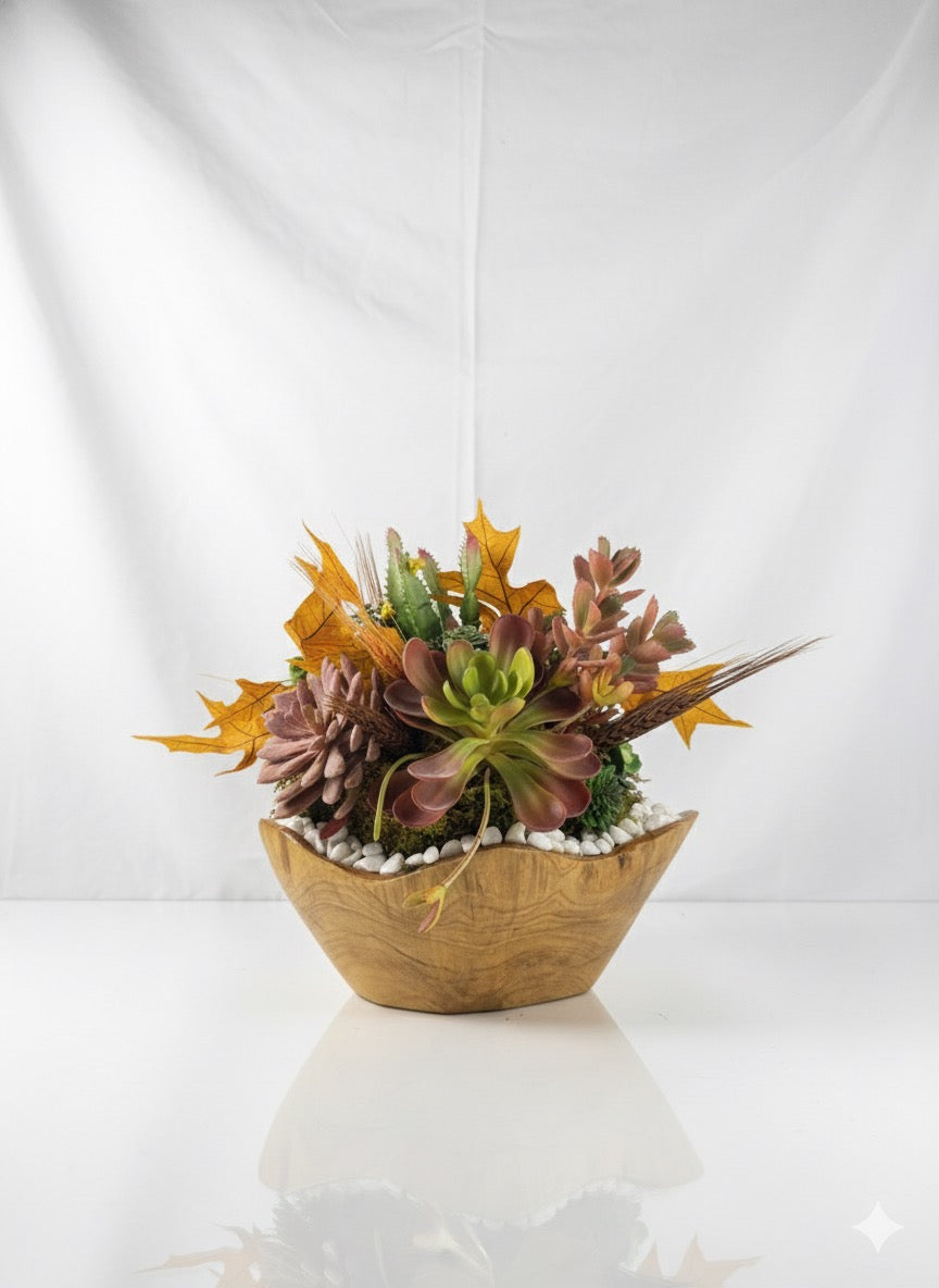 "Añade una sensación de otoño a tu hogar con nuestra hermosa suculenta Kivaar. Con diferentes variedades, estas suculentas traen alegría y color a cualquier espacio. Presentadas en una base de madera, son la opción perfecta para decorar tu hogar de forma natural y elegante."